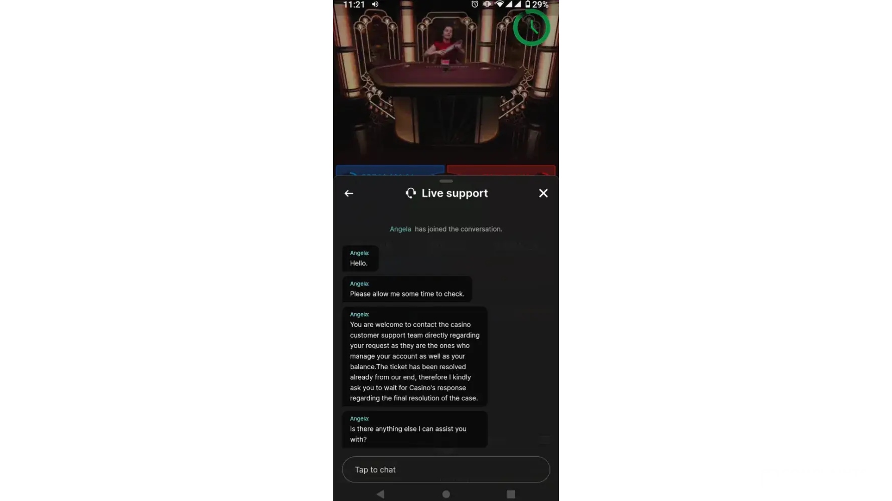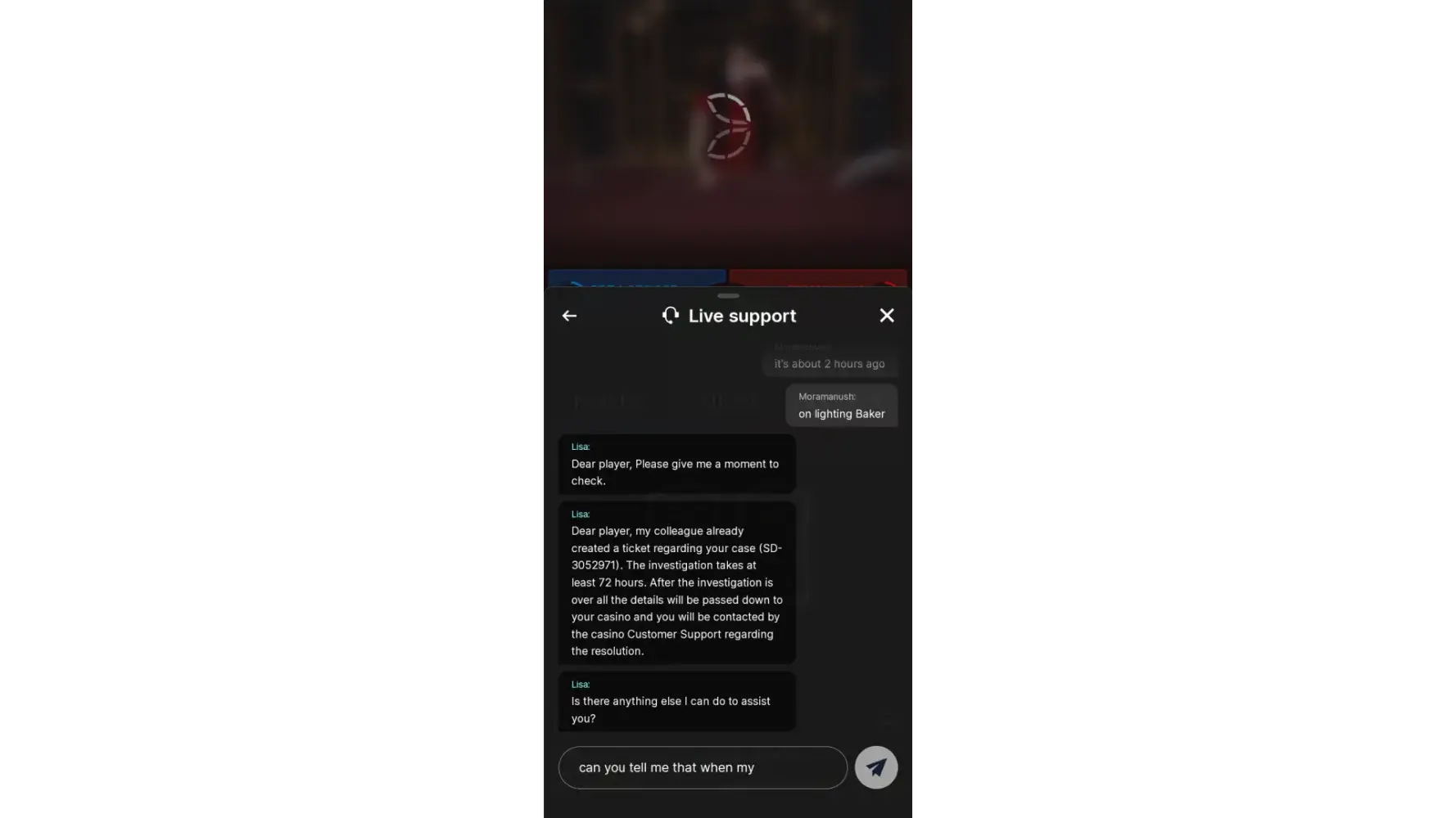I immediately contacted the casino live support team to report this problem. After investigating my account, they found some irregularities and created a ticket with the number SD-3052971 to resolve the issue. Although they informed me that the issue had been resolved, I have still not received my winnings.