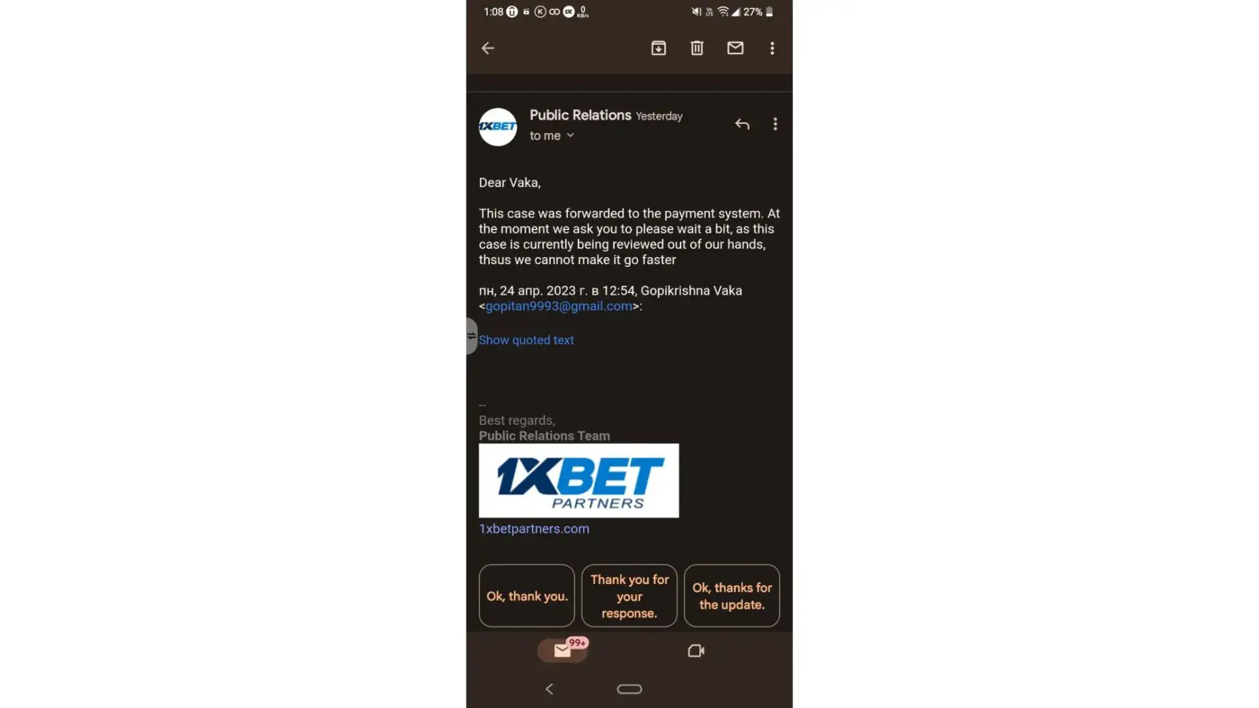 I am using 1xbet app, 17-04-23 I have deposited 1.7lakh and I have gained 3lakh, now there are not giving my withdraw amount. There is 3lakhs amount in that application which I have won, wantedly there are doing this and my 1xbet account id is [protected]. I have raised an issue and my ticket number is [protected] They have started asking me to submit the documents I have sent everything they have asked for, It has been 3 days but I don't see any update from their side Though they reply to the mail they just start asking again the documents and screenshot of my account details and this is happening fromlast 3days, Please help to get my money back