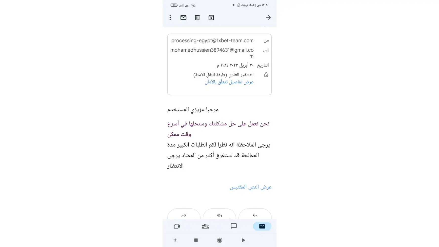 Desired outcome: لم يتم ØÙ„ المشكله ولا ÙØ§Ø¦Ø¯Ù‡ من ØØ¯ÙŠØ«ÙŠ Ø§Ù„Ø§ سوي رساله منسوخة ''Ù†ØÙ† نعمل على ØÙ„ المشكله "My mail,[protected]@gmail.comId,[protected]