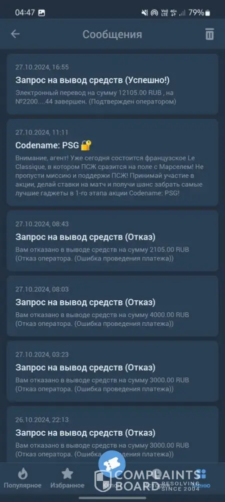 My account is [protected]. On October 27, I withdrew money from the bookmaker's office for a total amount of 12105 rubles. The bookmaker approved the withdrawal of funds, but the money was not transferred to a bank card. I can confirm this with a bank statement, a screenshot. The support service is not responding. My money was stolen.