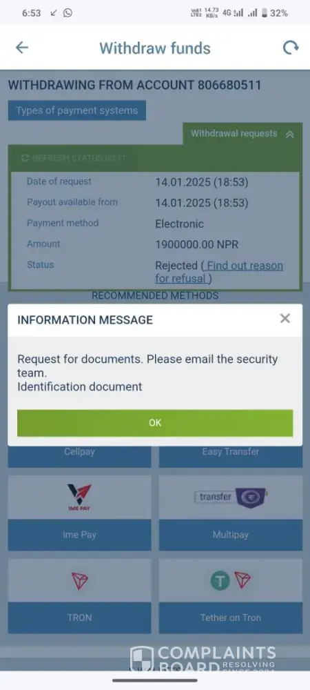 Withdrawal rejected due to identification documents