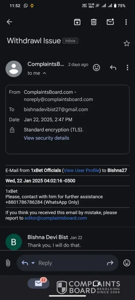 I am writing to formally raise a complaint regarding an issue I am facing with withdrawing funds from my 1Xbet account. I had deposited money into my account using AstroPay; however, I am now unable to withdraw the funds because 1Xbet platform requires withdrawals to be made via the same method used for deposit.