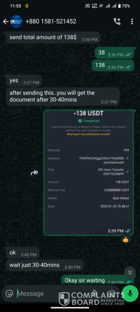 have deposited npr 880006.84 (usd 6494.76)through cryptocurrency exchange platform binance and i played online cashino called baccarat and i won certain amount while withdrawing the amount it says documents required email security team then i started mailing them i provided alll the documents about my 1x id and from where i deposited the amount that i...