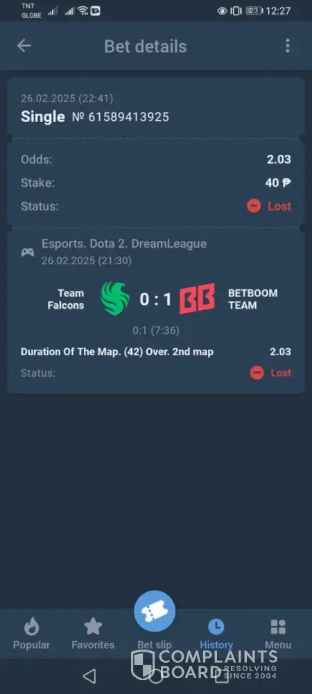 I bet on Betboom vs. Falcons 2nd map on Dreamleague s25 with yes on ultrakill. Despite having ultrakill from GPK's hero Ember spirit, even a rampage, the result was still a lost. [protected] this was my bet slip. This bet happened on the 2nd round of groupstage. Happened in February 26,2025 at 2nd match. Please help me solve this problem as I think the result was faulty.