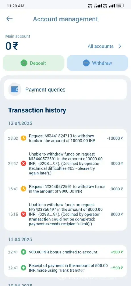 I have made request for 4k on 9th April they rejected 6k on 10 april they rejected 8k on 10 april they rejected 9k on 11 april they rejected 10k on 12 april is in processing and today they will also rejected. Reason giving limited exceeded or denied by operator. I don't know why they are doing this. Actually they harassing me. Kindly resolve my issue and make succes my withdrawal so I can make some payment. Thank you.