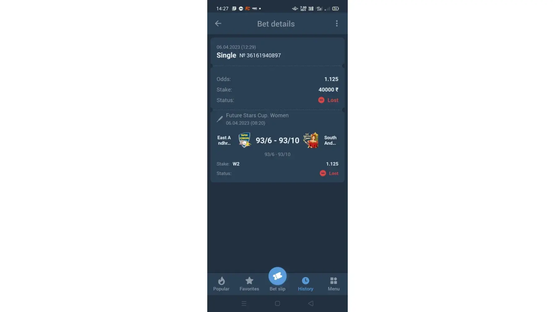 The match between East Andhra vs South Andhra of the Future Stars cup women played on 6th April,2023 was won by Team2(South Andhra) but 1xbet have settled the bet as a draw and calculated my bet as lost.