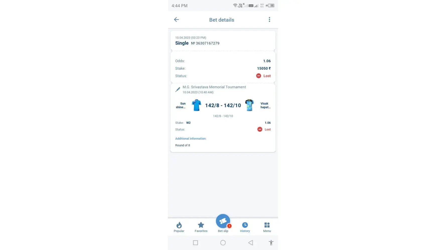 This is regarding bet slip [protected] in 1X bet. The team 2 ( VISAKHAPATNAM RAILWAYS ) have won the match. But due to some technical score update glitch it is showing as drawn and i lost the bet.
