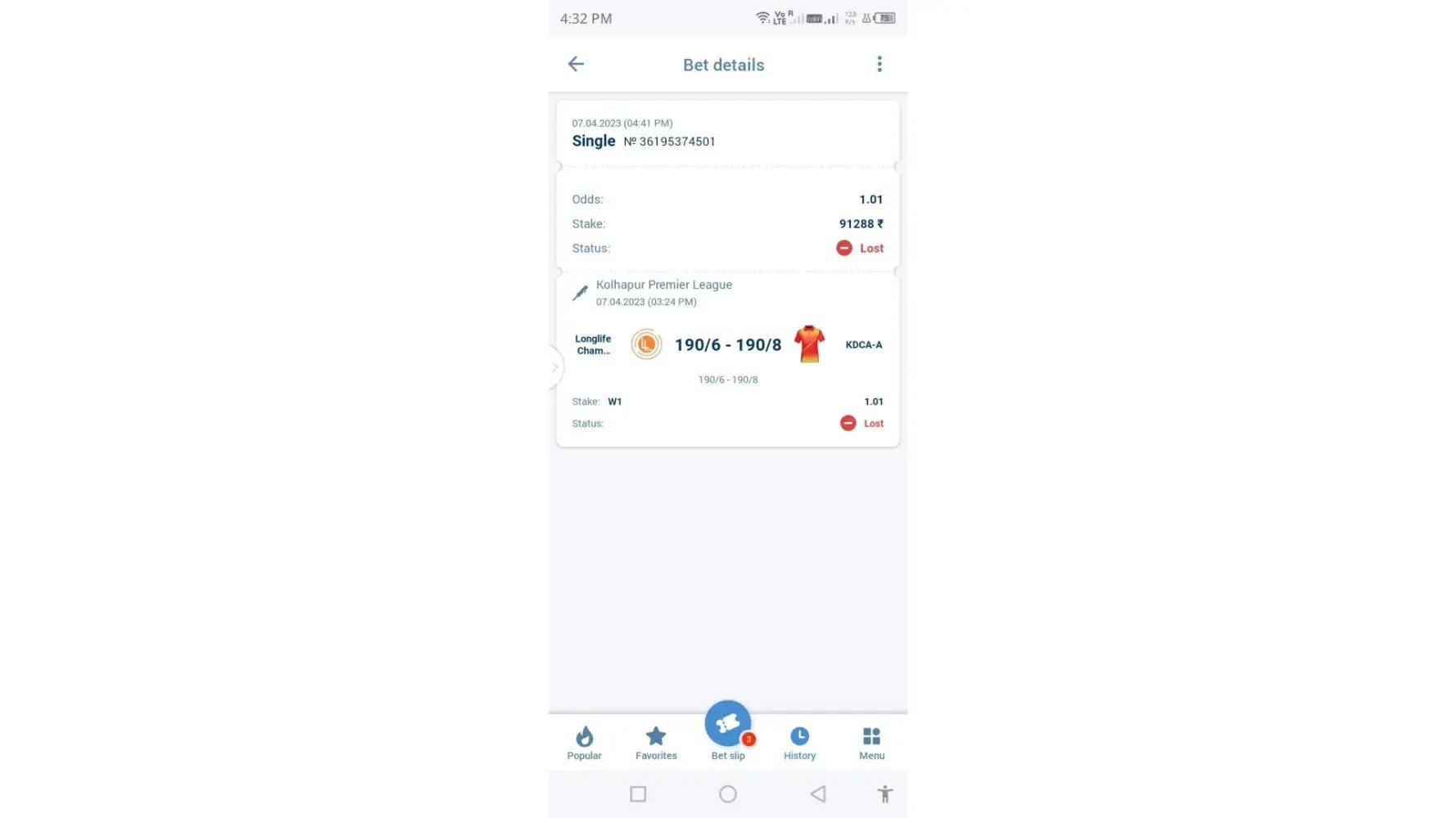 1st fall you send wrong link match .I'm talking about longlife champion and Kdca-a team match please check scorecard also .You are sending me link of match between East Andhra super striker and south Andhra super queen this is not my bet match .My bet slip number is [protected] match between longlife champion and Kdca-a team.please check carefully Target is 190/6 which made by longlife team and Kdca-a team made 106/9 which is clear win by longlife champion team.please check my link now https://cricheroes.in/scorecard/6361405/Kolhapur-Premier-League-(-KPL-2023-)/LONGLIFE-CHAMPION-KOLHAPUR-vs-KDCA-A