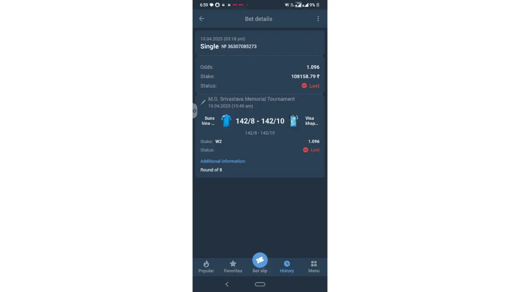 My bet slip number is [protected] match between longlife champion and Kdca-a team.please check carefully Target is 190/6 which made by longlife team and Kdca-a team made 106/9 which is clear win by longlife champion team.