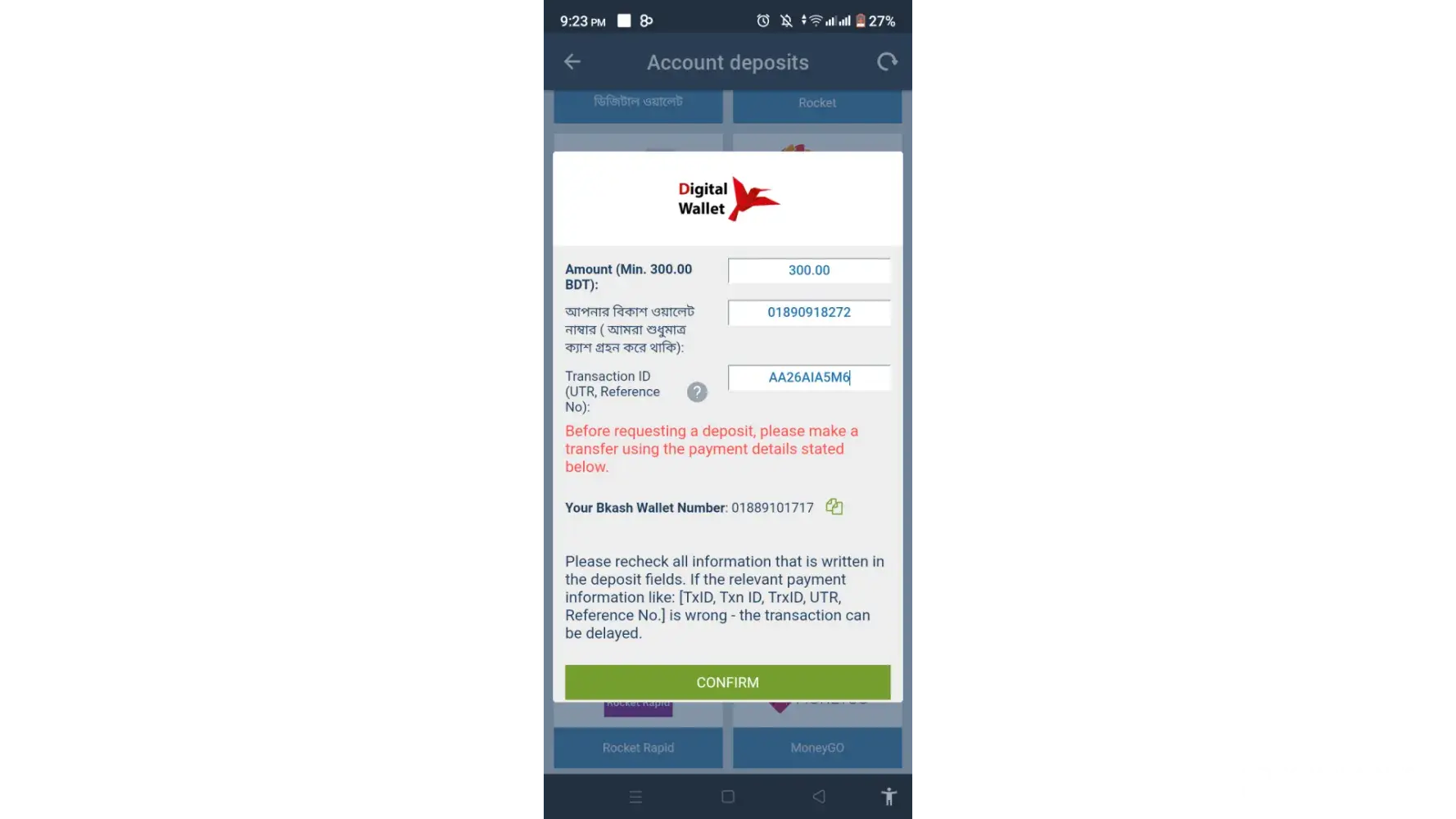 মার à¦à¦‡ উইডà§à¦°à§‹à¦•ৃত টাকাটি সঠিক à¦à¦¾à¦¬à§‡ পাইনি। যেমন আমি ১৬০০ টাকা উইডà§à¦°à§‹ দিয়েছিলাম যা আপনারা à¦à¦•à§à¦¸à§‡à¦ªà§à¦Ÿ à¦à¦¬à¦‚ কনফারà§à¦® করেছেন। কিনà§à¦¤à§ আমার কাছে টাকা à¦à¦¸à§‡à¦›à§‡ মতà§à¦° ৬০০ টাকা। বাকি ১০০০ টাকা কম আসার কারন যানিয়ে আমি à¦à¦•টি ইমেইলও করেছিলাম। কিনà§à¦¤à§ ১২ ঘনà§à¦Ÿà¦¾ অতিকà§à¦°à¦® হয়ে গিয়েছে। অথচ à¦à¦–নো পরà§à¦¯à¦¨à§à¦¤ কোনো রিপà§à¦²à¦¾à¦‡ পাইনি। দয়া করে আমার পাওনা অরà§à¦¥ আমাকে বà§à¦à¦¿à§Ÿà§‡ দিন। হেলো সà§à¦¯à¦¾à¦° আপনারা à¦à¦–নো পরà§à¦¯à¦¨à§à¦¤ আমার à¦à¦‡ সমসà§à¦¯à¦¾à¦Ÿà¦¾à¦° কোন সমাধান করেনি।