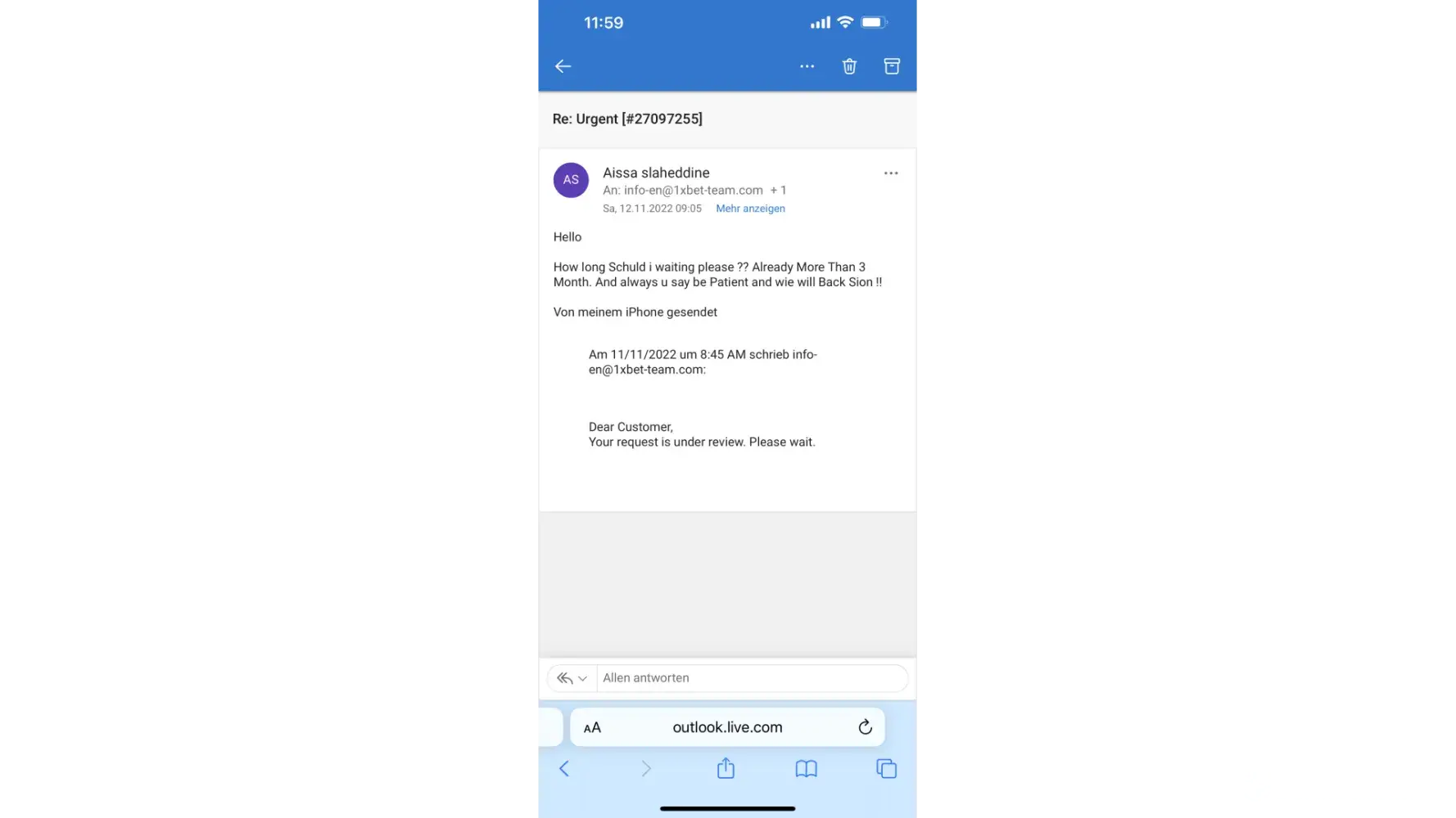 Ohhh :) I have the same case since 6 Month they block my account with the first deposit 300 Tunisian dinars … after that no answer for my emails …. Telef support they say be passion and then they block my number …. Always the same case with all client about 1xbet … they block the money and they ignored you … is my mistake that I open Account in such company … very miserable really …