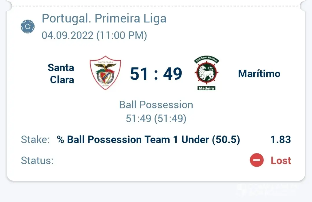 Portugal premier league official website shows, Santa clare vs Maritimo match ball ppssession is 41:59 but you confirm the possession was 51:49. I took Santa clare 50.5% under but it lost. Why lost? Which source you follow for counting the ball ppssession? It is tottally unfair. I providing the official website link. Plz check that inform your officials.