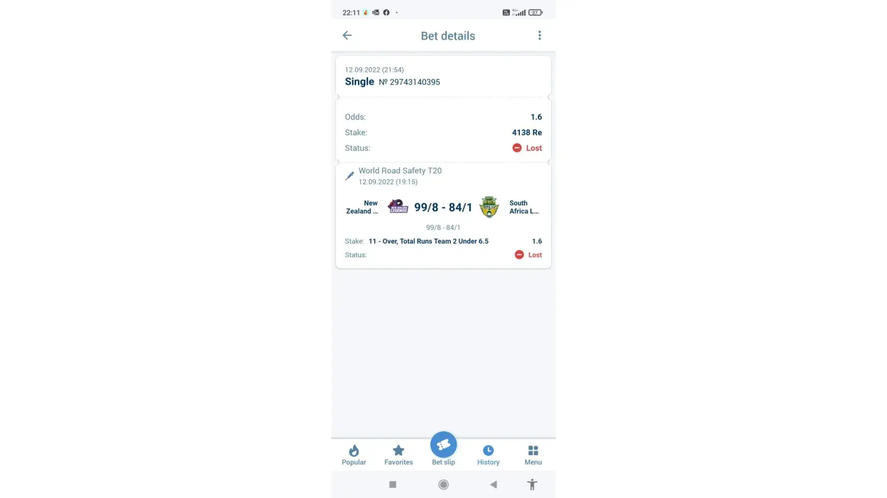 As per the below attachment I have placed a bet for NZ VS SA Legends Cricket match (World Road Safe T20) on 12/09/2022. As per the result my bet is correct but I lost my money from that. Please attend to this as soon as possible, I am waiting hear from you immediately.. thank you.