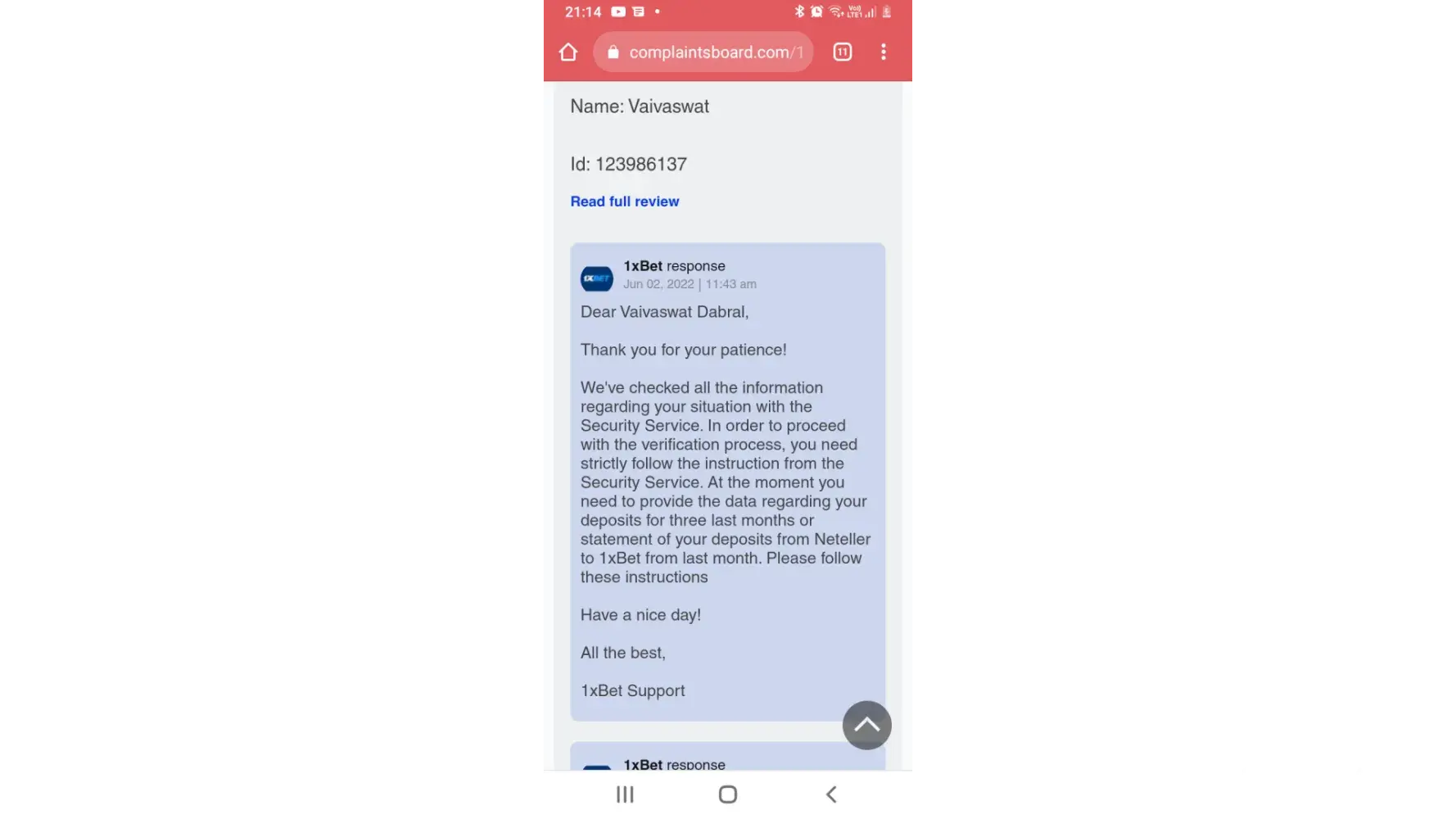 I also complained it here and 1xbet reply here to send my ID number and others details to Their Facebook page. I also sent it to their Facebook page massage.