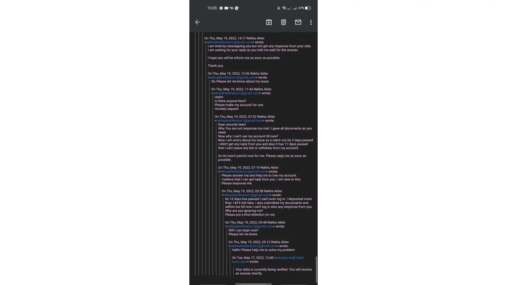 Date and time of first report to support: 15 may 2022 I mailed to support team.