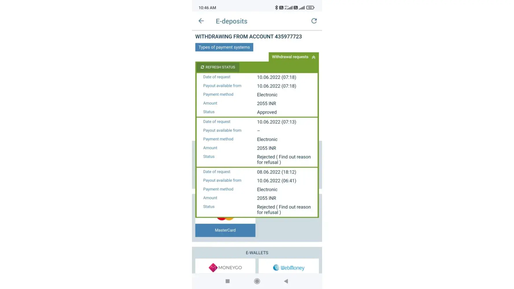 I have made withdraw request 9 time but all time they reject my request ..not a single time they completed my withdraw request while using same method to withdraw which I deposit.i have tried to contact thier support but they are not helping me..every time they say thay your withdraw can take up to 48 hours..after around 40 hours they reject my withdraw request and say create again a request