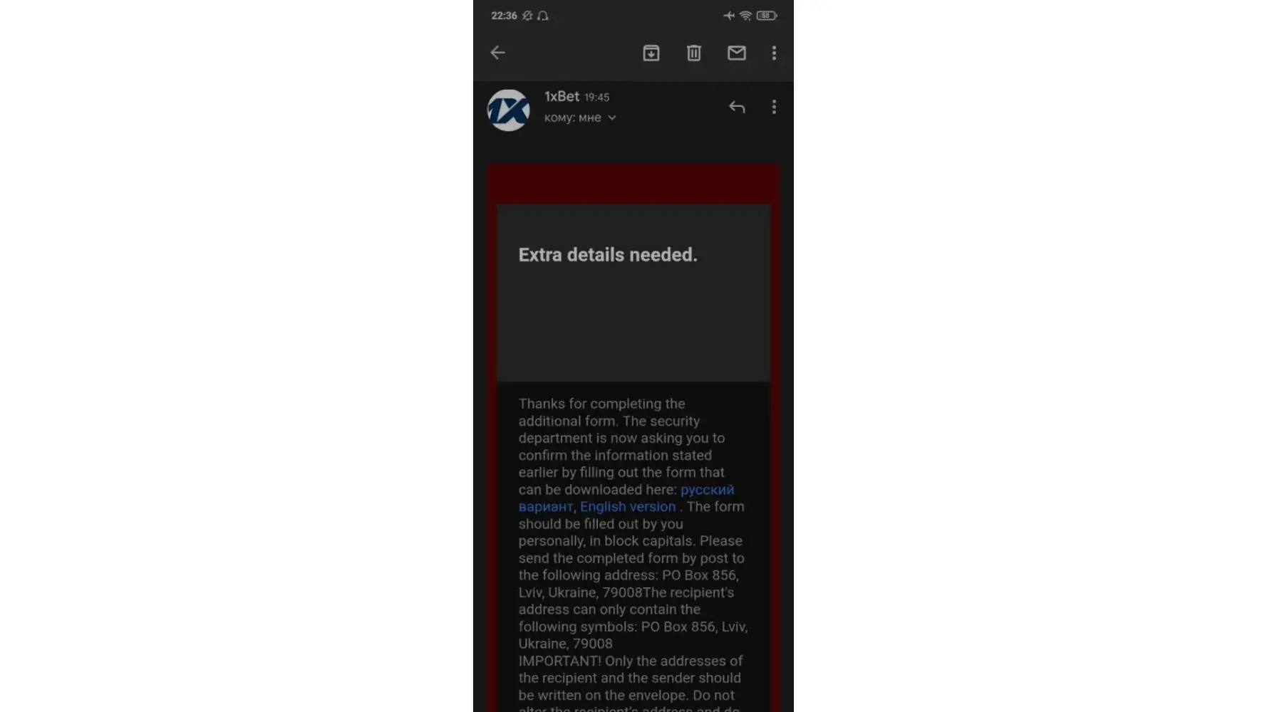 Also closed to my device where they can see all my email messages clearly. I did all what 1xbet requested but was able to withdraw.