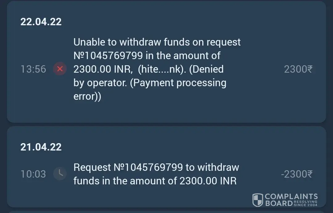 I have done a widrawl request of Rs. 2300 on dated 22 April but somehow it's got rejected by the operator. And the money got deducted but not received the amount till yet.