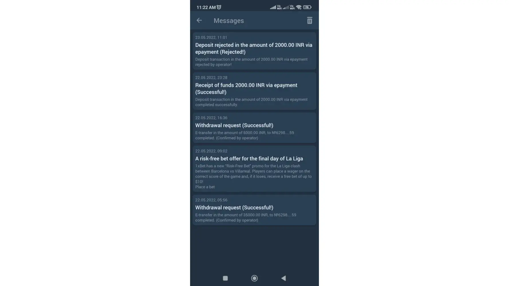 Last 16/05/22 i deposited my 1xbet account amount of 2500 taka by " fast nagad"