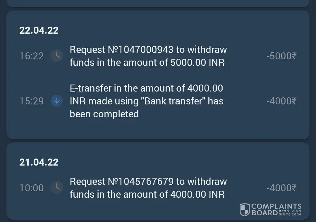 I have done a widrawl request of Rs. 4000 on dated 21 April, money shown the transfer been completed but till yet I haven't received the payment. I have also put mail to 1xbet team with screen shot but no further solution found.