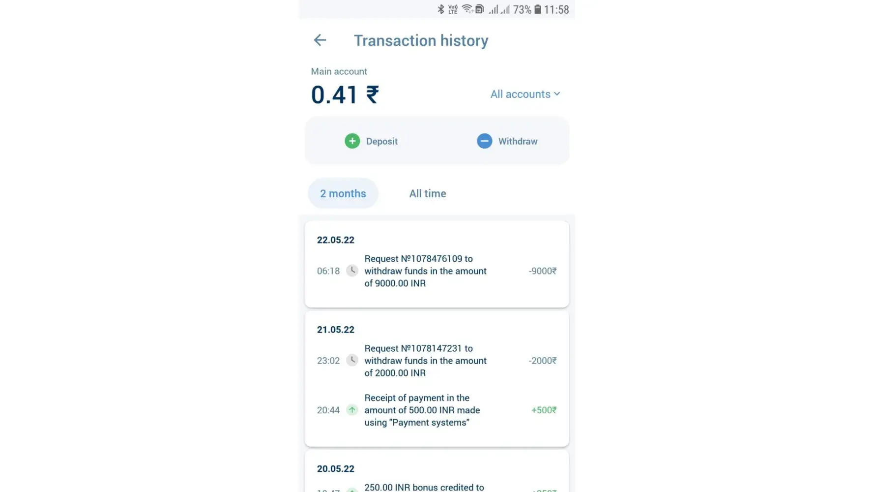 Sir i tried to deposit an amount of 500 on 29/04/2022 9:16pm through upi fast method . i made the payment successfully but that amount is still not credited in my 1xbet account.