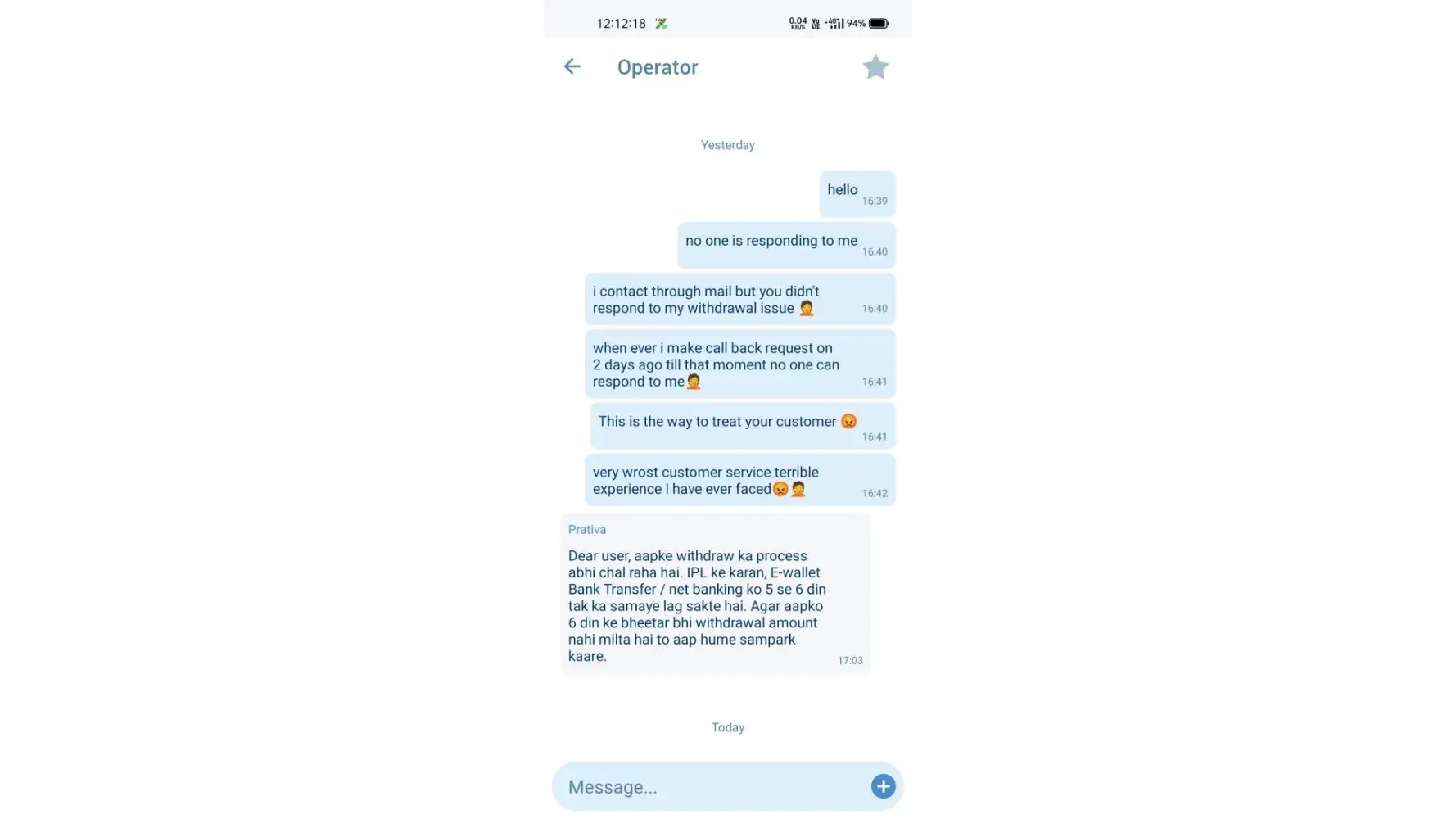 I made 4 times withdrawal request in this past 9 days all these times the withdrawal request is denied by operator due to the reason this IPL season there is a server issues, I also contact your customer service through chat session but all those times they said please wait for 7 days it will take upto 7 days,but after one day the requested amount is credited into my 1x account then how many days long to withdrawal my money it is so irritating to me🤦