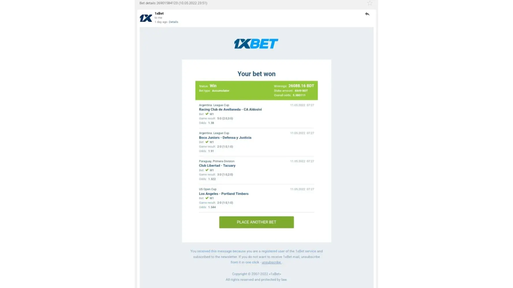 The amount of bet was 4849 Bangladeshi Taka. I have won all the Match and even 1xbet email me that I have won the bet (already give attachment)