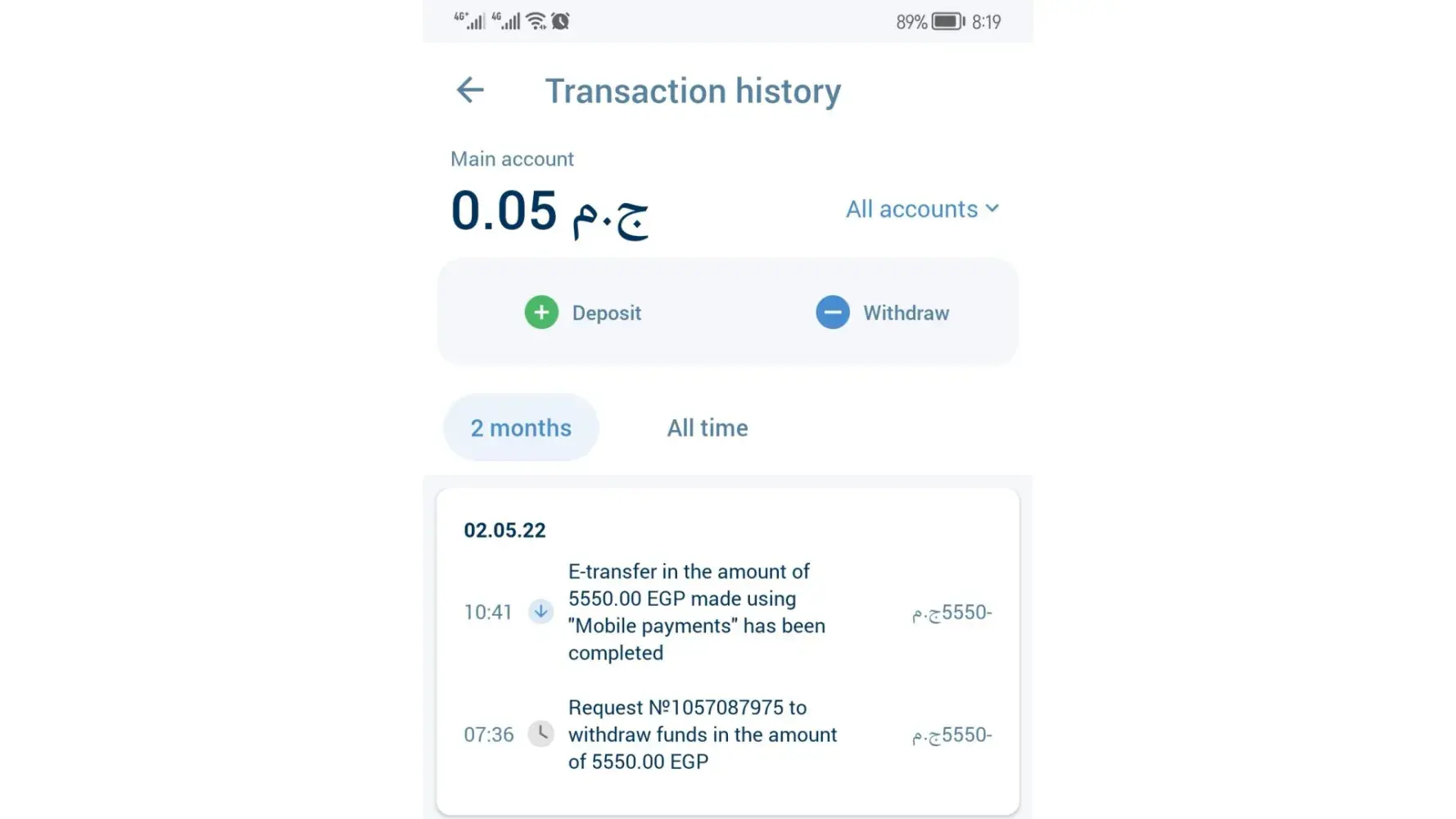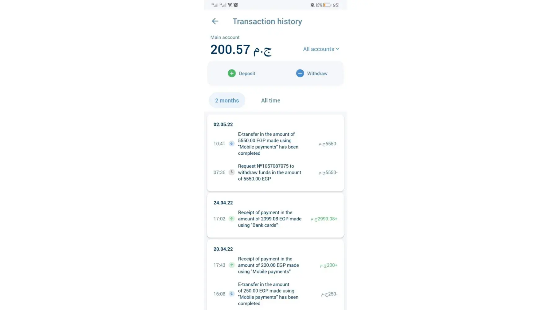 Deposits and withdrawals are made from electronic wallets, Etisalat Cash wallet, and the complaint is about a withdrawal process, not a deposit, because my number [protected] has exhausted the maximum limit for receiving funds on it, which is specified by the issuing company, Etisalat.