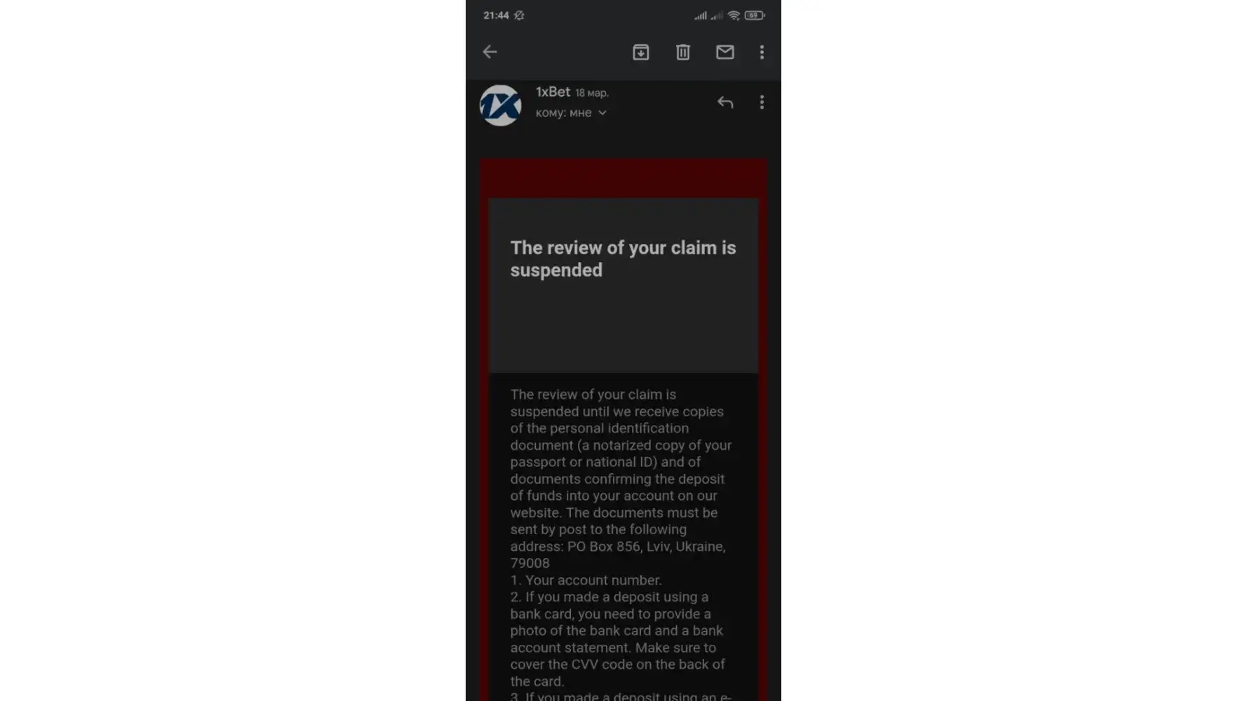 ID code is [protected], I recently got a loan, I bet this money on 1xbet, I won fair, but 1xbet blocked my account. and a notarized copy of your passport. When I visit post offices in my country and ask them, they say they cannot send documents to Ukraine because of the war. I want to hang myself because bankers come to my house and ask me to return the debt