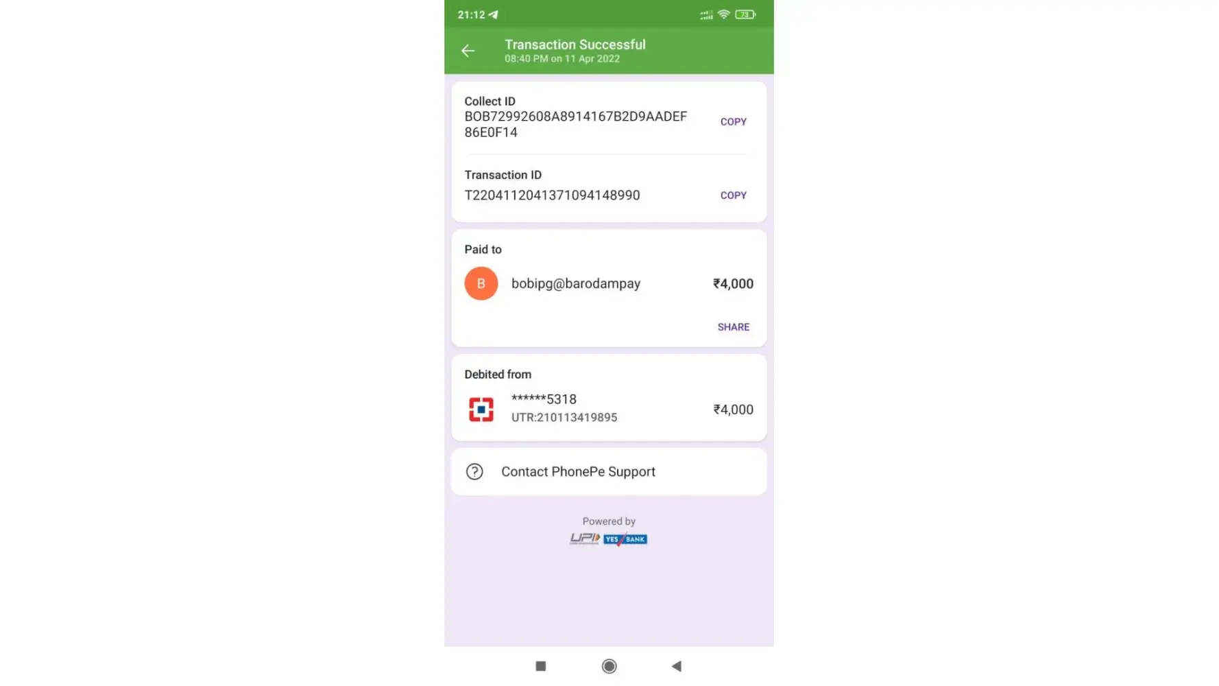 Actually I have made the transaction through upi(phone pe) after successful transaction when I have entered the 1xbet app where I have to submit the transaction information it says like this payment identification number is already in use but I have not created the request untill then the payment was successful but my money was not credited to the wallet