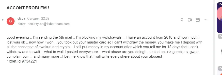 If needed i will share the screenshots of the mail what I had sent to 1x bet team.