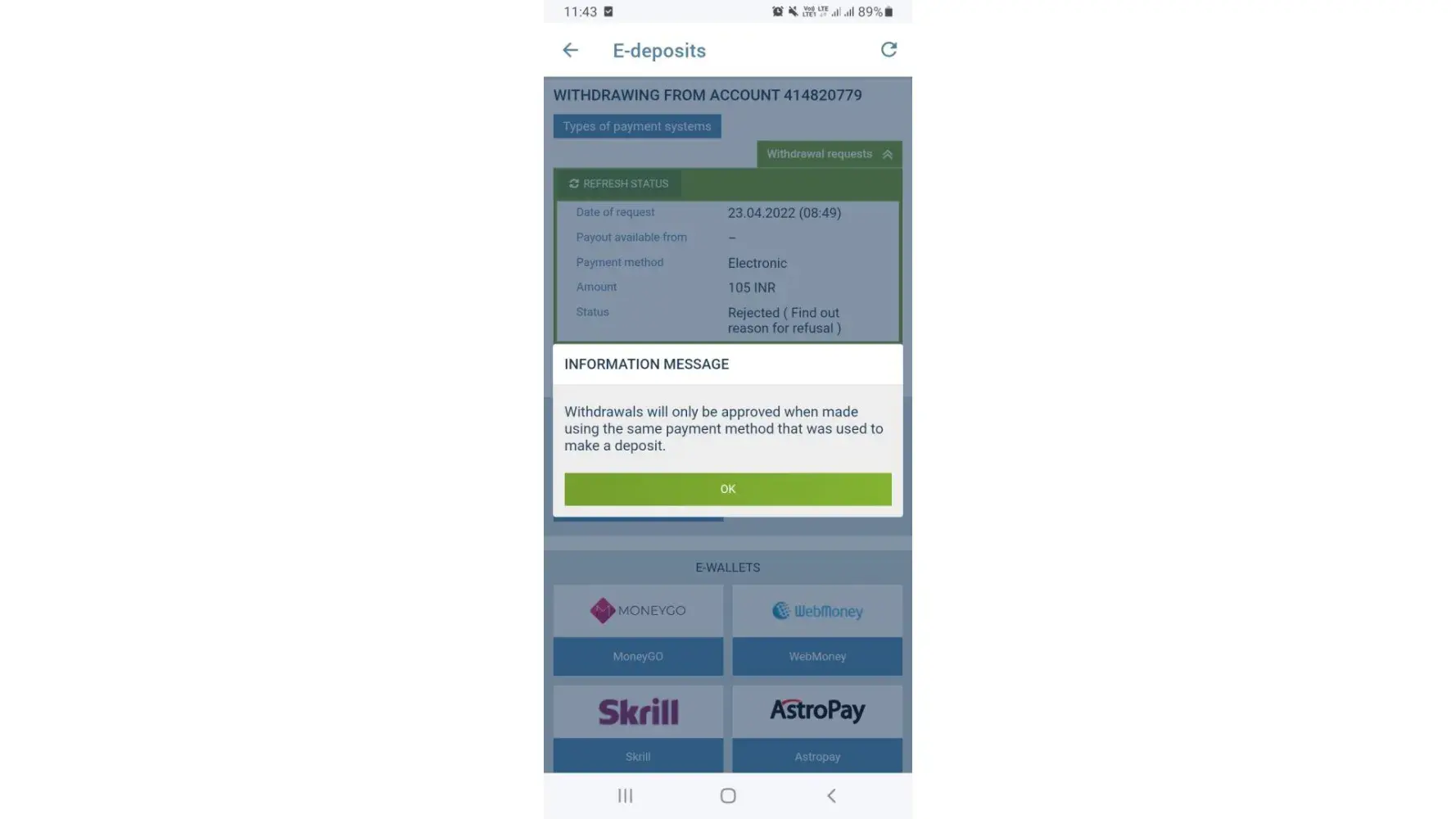 after it after 72 hours asked me to send my deposit transactions by my e-wallet.