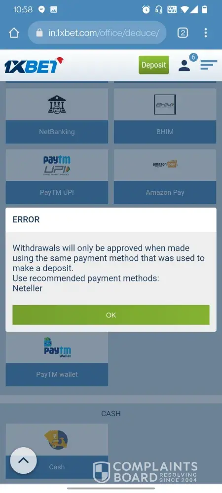 I deposited money through UPI mode and now even i cannot withdraw because I am am getting error while withdrawing to use Neteller as withdraw mode. I have used multiple modes for deposits now but during withdrawal they it gives attached error message and ask me to withdraw through Neteller app only but in reality they have blocked withdrawal through Neteller.