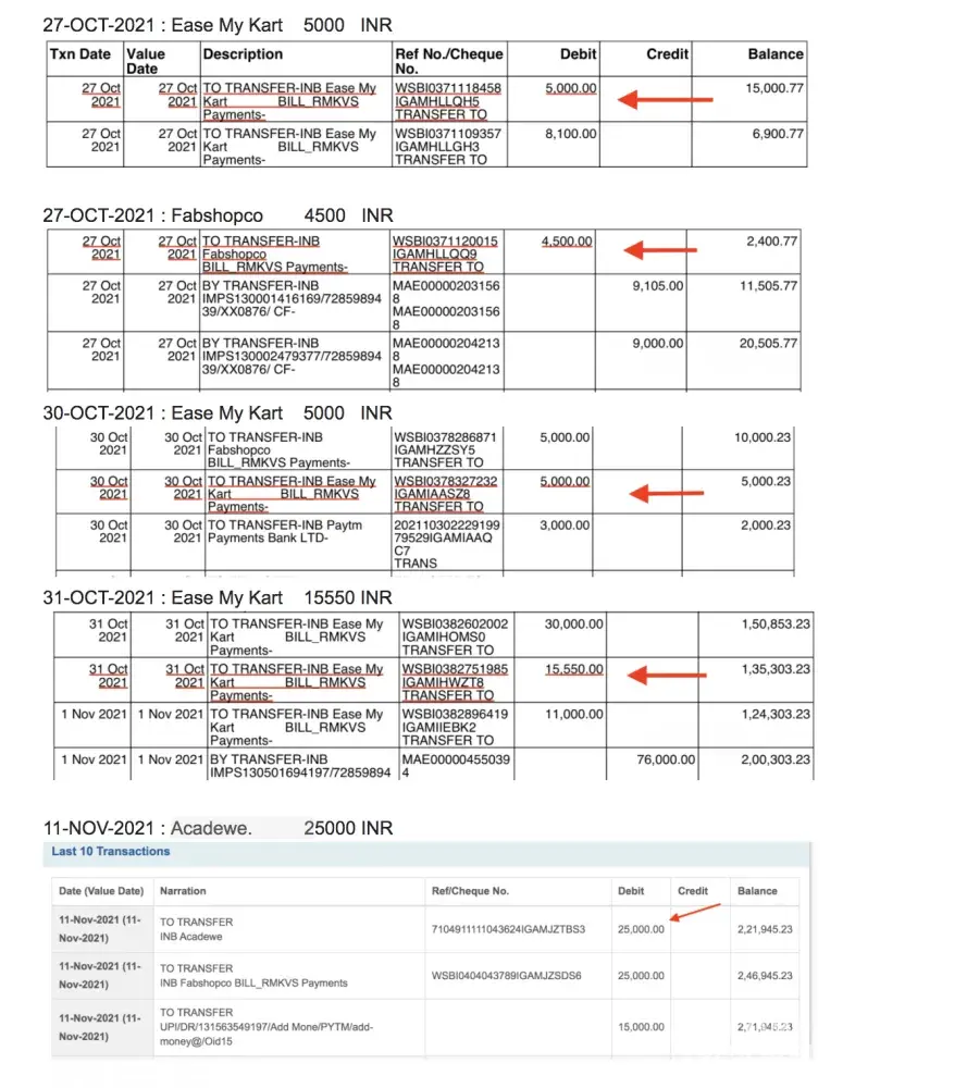 Following four transactions to Easemykart and Fabshopco happened through paydoor9 gateway.