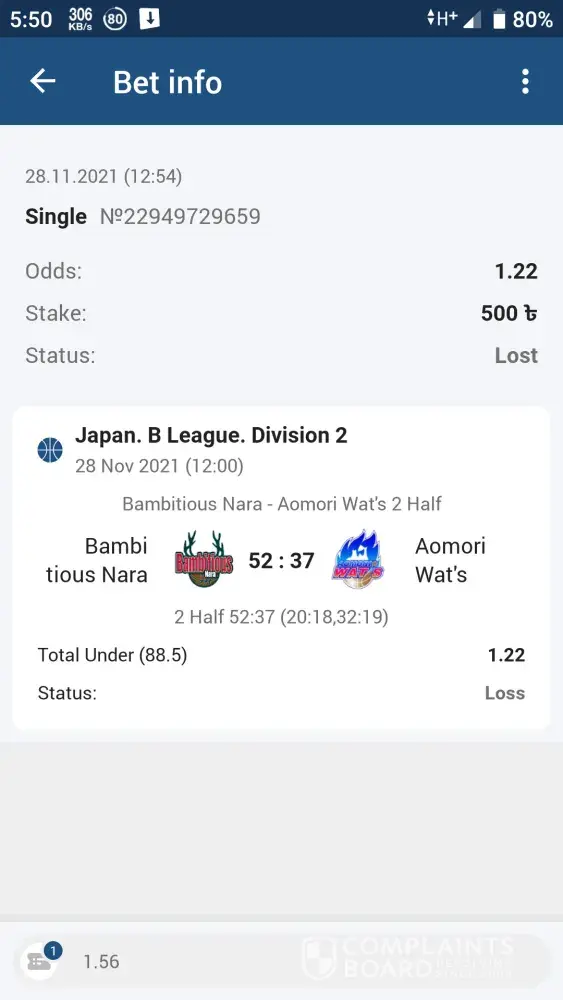Today at 12:54 pm time in local, i bet on basketball in Bambitious nara vs Aomori wat's match. I bet on (2 half, total under 88.5).when the match finished the bet slip is not setteled.i check on google for correct score and then i ensure that i am win.but after 4 hours the bet slip shows the bet loss, the score was incorrect in last quarter. I again search the match and check maximum website for correct score.all the websites shows same score and only the 1xbet shows different score in last quarter. I bet under 88.5 points, google and others website shows the match finished in total 86 points. But only 1xbet shows total 89 points. I mail there mailing address but not fix yet. I tries to connect with chat but no one replies me.i think they would not solve this problem.