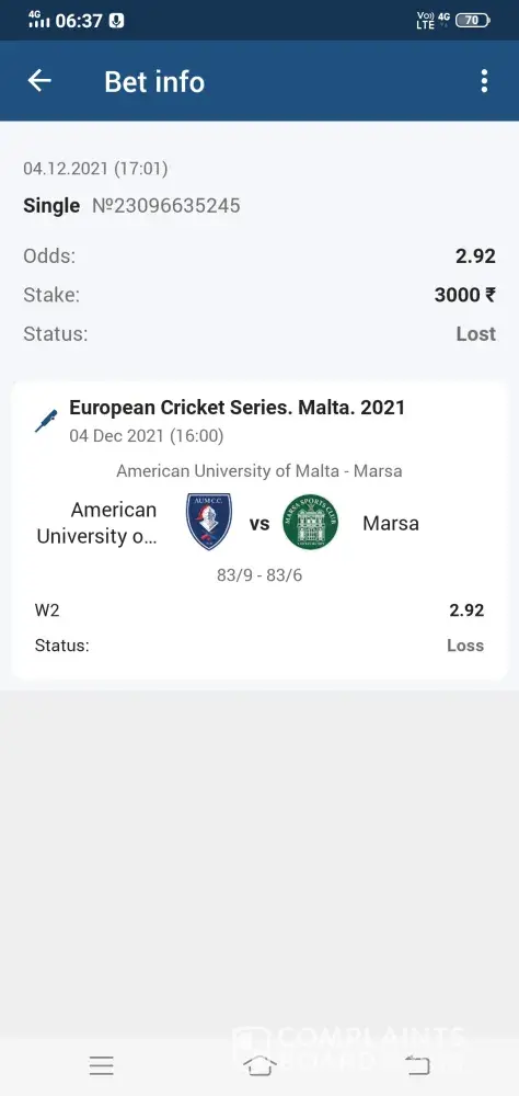 I have placed abet w2 team from Europe t10 cricket league rupees 3000 with bet slip number [protected].actually the match was won w2 team.in 1xbet app this match was drawn and lost my bet seen.