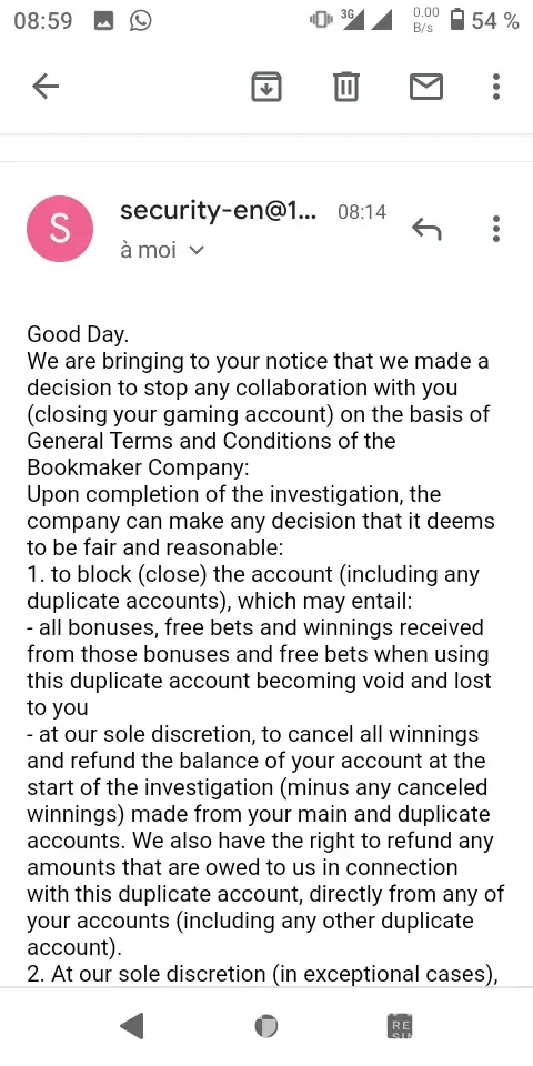 We are bringing to your notice that we made a decision to stop any collaboration with you (closing your gaming account) on the basis of General Terms and Conditions of the Bookmaker Company: