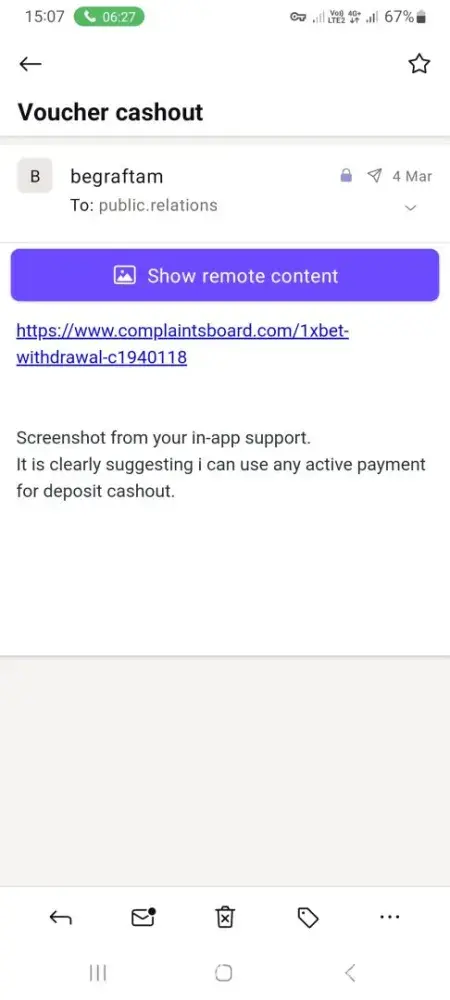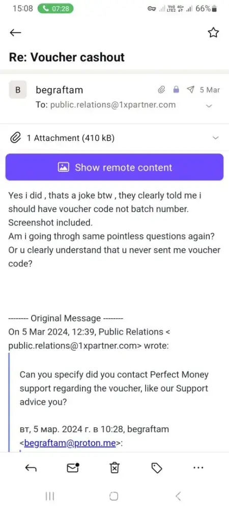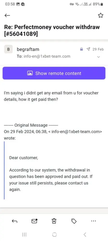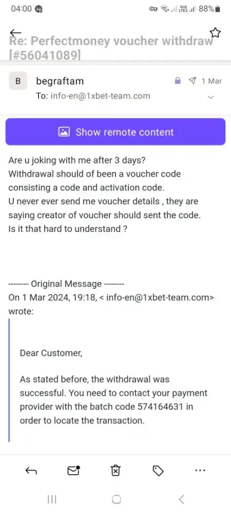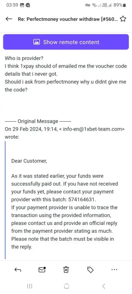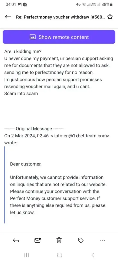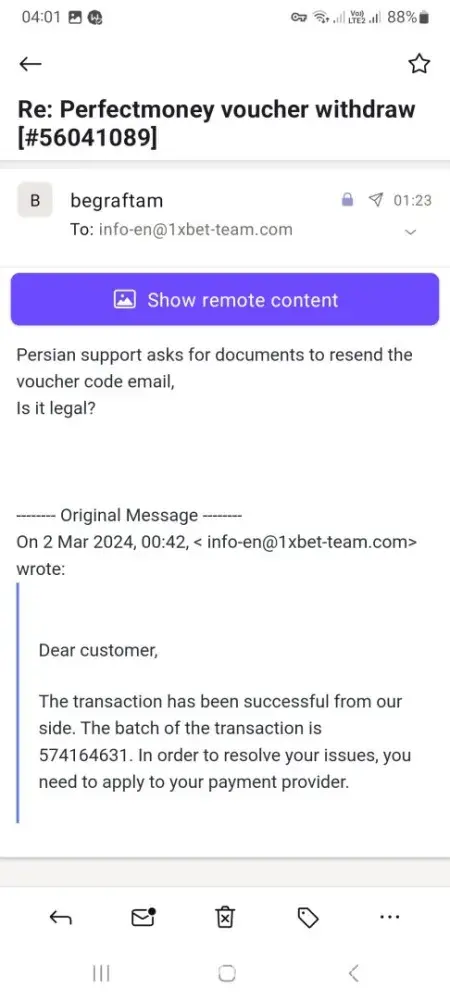 I'm Bettor from iran, through 15 years of my betting journey never experienced something shady happend this week on 1xbet. I used to deposit/cashout using perfectmoney there. Lately cuz of pm restrictions for iranian users site support suggested me to use pm vouchers. The way vouchers work is with 2 identifier. 1. Voucher number, 2. Activation number Basicly owner is the one who has these 2 identifier of voucher. This week I requested 15$ as a voucher (funny considering the amount I deposited there) Request approved and I received completed msg in app, But never got anysort of voucher code in my mail. Funny part begins from here. When I open support section gives me persian operator that I dont need, I totally prefer english support for problems that im getting They asked me to sent documents to resend the voucher (they never realy send though) How legal it is? It is not, Cuz they are not responsible party and not even reliable to have personal documents, they are just section to handle payments with iranian banks. (that im certaily not part of) im using international banking systems for the job. [protected]@1xbet-team.com When I contacted 1xbet officiall This guys are from another planet it seems, they reapeatedly saying ur payment is done, this is batch number. totally unrelated answers they provide. Go ask perfectmoney why we didnt give u you voucher details, I will put emails screenshots and their funny answers.