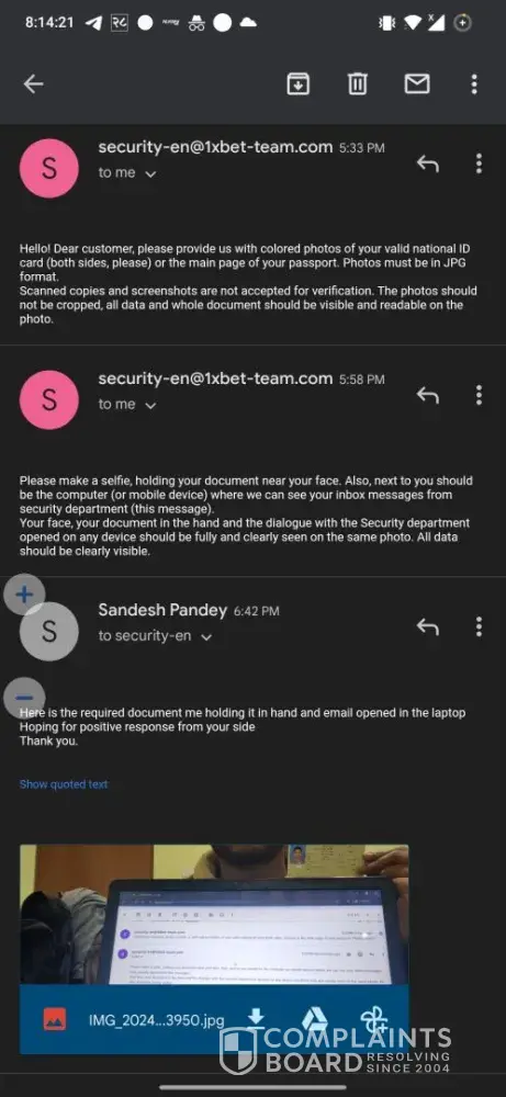 I am writing to express my profound dissatisfaction and concern regarding my account (ID: [protected]) with 1xBet. After successfully verifying my account for the first time, I was unexpectedly asked to undergo the verification process once again following my recent winnings.