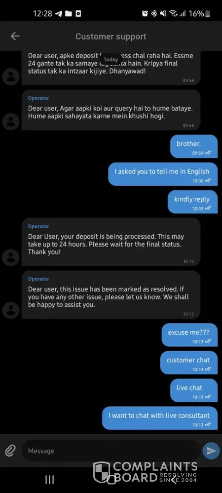 One of your staff is telling me that money deposit is in process and will be shown in my account in 24hrs? Isn't crazy 🤪 I have not done any deposit in my account but just look up how the staffs are giving a false and not suitable reply which is totally against the issue just to close the chat? (Unprofessional behaviour)