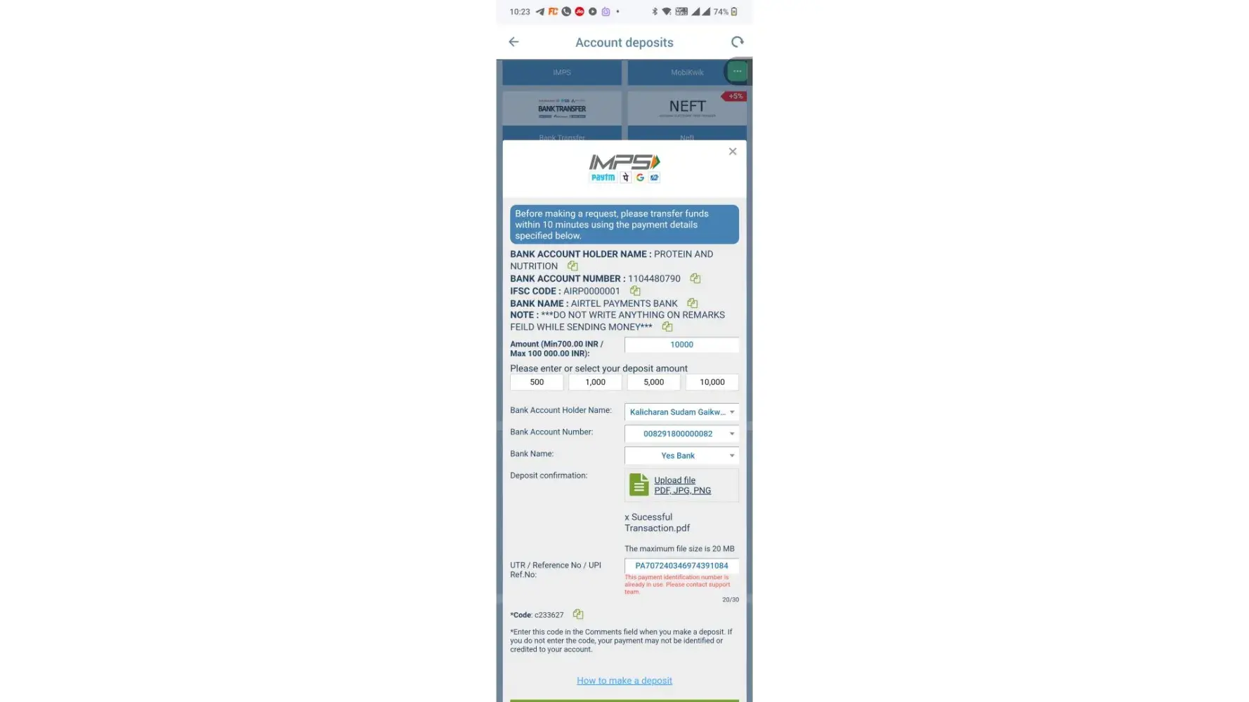 I have made the payment using IMPS mode on 28th Sept’23 for Rs. 10000/- to aaf enterprise account, which was successful.