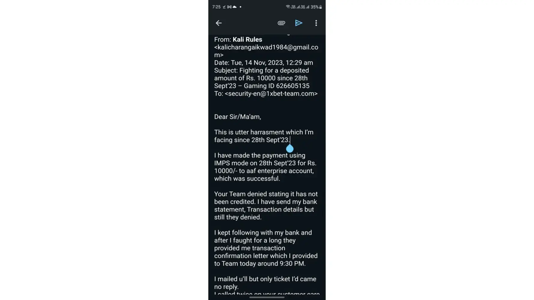 I have mailed them many a times on your given mail I'd that is info-ind@1xbet-team.com but your team didn't deposited the amount.