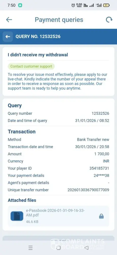 I would like to raise a complaint regarding my withdrawal transaction. My 1xBet Account No is [protected] and Username is SMRUTI86. Last night I placed a withdrawal request of Rs.1700 to my savings bank account. Today morning at 8:04 AM, your operator confirmed that the transaction was successfully completed. However, till now the amount has not been credited to my bank account. This delay is causing inconvenience and concern. Kindly verify the transaction status at your end and resolve this issue at the earliest by ensuring the amount is credited or providing proper transaction details. I request your prompt support in this matter.