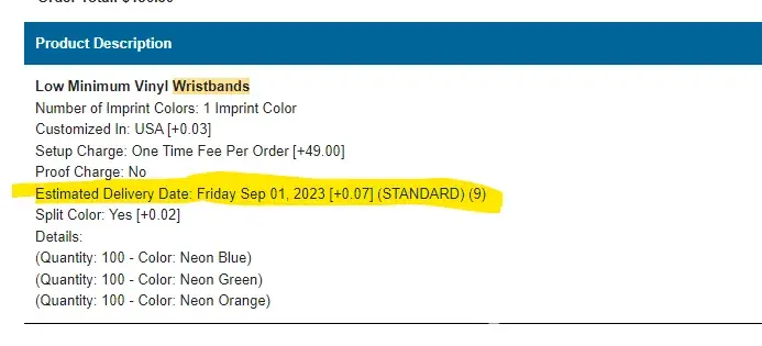 DO NOT order from this company if you want to receive your product(wristbands) in a timely manner. I was given an estimated Delivery of 9/1/2023 and they weren't shipped until 08/31/2023. My event was 09/03/2023, so I was out of luck. I had to resort to paper wristbands.