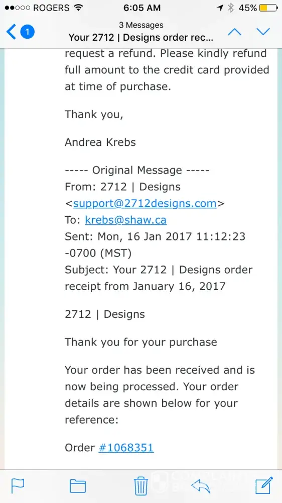 Our conclusion: ComplaintsBoard's review suggests 2712 Designs is generally legitimate and safe for transactions. However, with a resolved complaints rating of 0% we recommend that you stay careful. Before interacting with 2712 Designs, take the time to review customer feedback and the approach to resolving complaints.