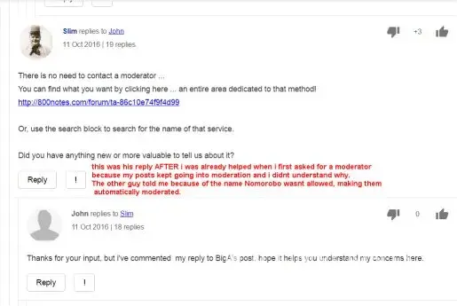 I made a post about a number that i had information of, more than just that they called, but my post went right into moderation. I attempted several times to post it, but then asked what happened and could a moderator explain. A registered user answered my questions just fine and i was ready to move on. A second registered user then started asking questions, even though he could see i had been helped, i even said that i had been helped. He continued asking questions towards the validity of what i had posted, or wanted to post but couldnt due to the site blocks the name Nomorobo. My post was specifically about that blocking service since it was their number i was posting about. He baited me by asking me to post an external link to prove the number was specific to that service as i claimed. I tried, but it went automatically in moderation and he knew it would. He then badgered me saying if i cant prove it i must be a troll and then edited his post once he realized i was right and i replied before i seen it. He then removed my posts saying that i was being nasty and not helpful.