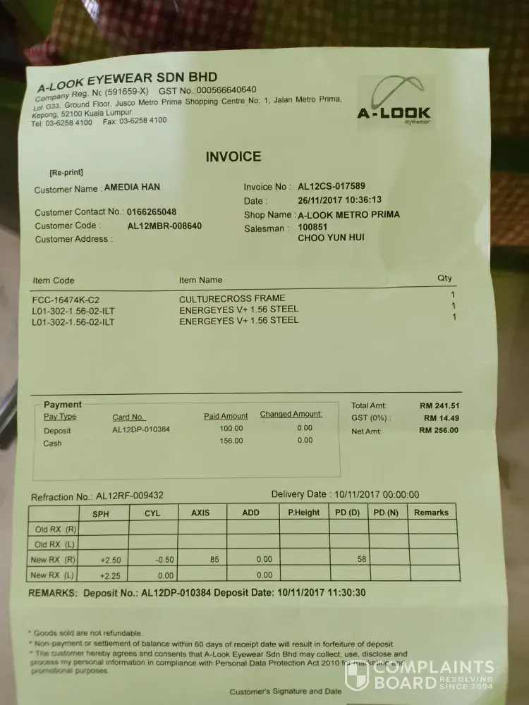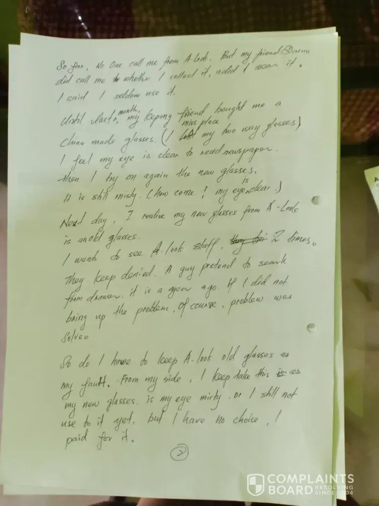 25/2 - I had went to Alook at Dpulze branch to buy a new spectacles. Upo checking the eye, the staff told that my 'silau' and power had increased highly. Before is 1.75 and new one is 2.75. And i have pay more coz of the power increase which is rm258 instead of rm168 for the frame n normal lense.total all is rm500+. Upon collection, staff mentioned it will take 3 days with headache. However after 1 week using it, i still have bad headache even when in office but when using old spectacle no problem. I decided to go back to the shop and ask them to follow old power which should be lesser price. When i ask bout refund, they say that they cant refund because change lenses and high power will take more times. How can i do work like this? And nobody tell me on this. This is not first time i wear new spectacles. This is so unfair because it is not my mistake and the staff seem not responsible at all! I urge to you to refund back the balance or if not please refund 100% my money back. Failing which I will bring this matter to the authority.