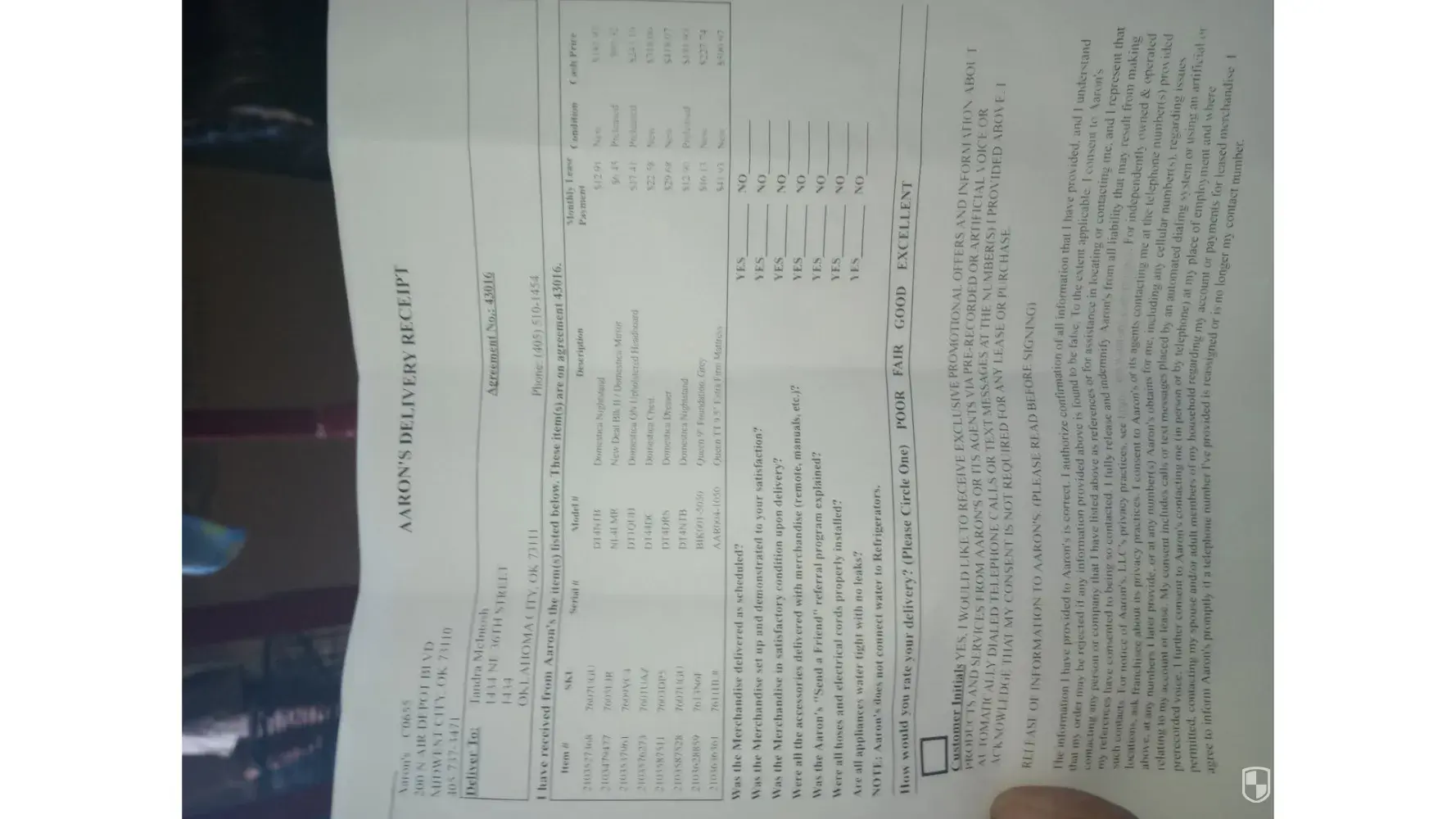 Hello, my name is Kassy Madril. I entered into an agreement with Aaron’s furniture rental in La Junta Colorado on July 5th 2024. I signed a lease to purchase a Samsung 4.0cu foot washer, in white, as well as a matching white Samsung electric dryer 7.2cu foot. This has been above and beyond bad business on their end. It’s not one or two things, but many and I am only 7 months in and its ongoing. It’s still not rectified and I feel like they feel no urgency or even need to hold up their contractual end in any timely manner if at all, at this point. This is rather frustrating and if this doesn’t resolve the issues. I’ll have to seek legal help as a last resort. I am truly hoping that you will be able to do something.