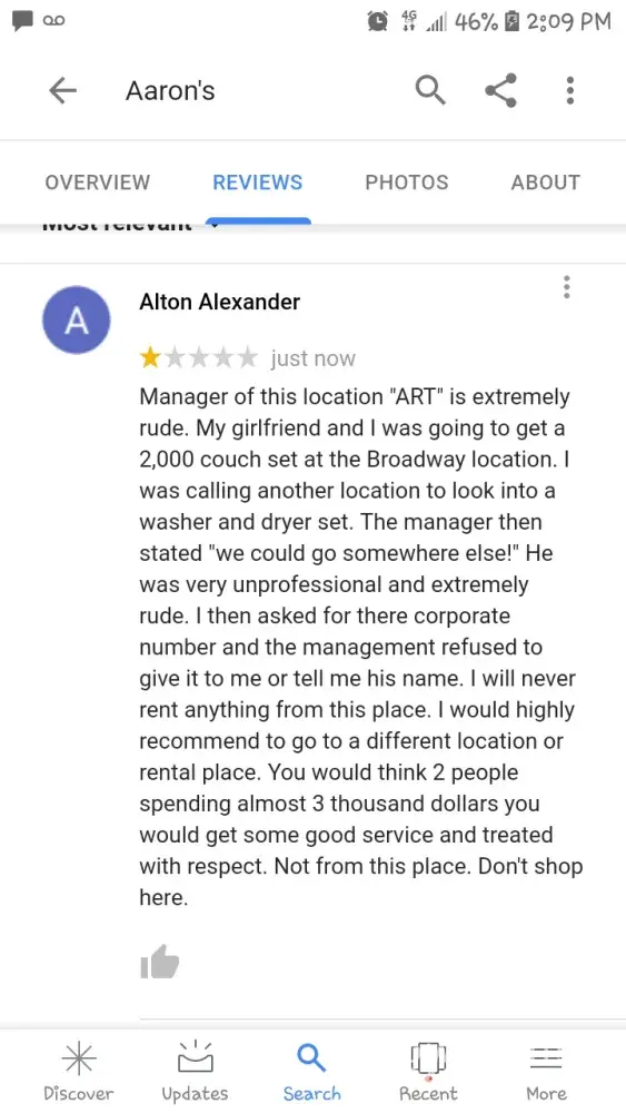 Almost a year to the day I went to Aaron's to get a mattress and boxspring the guy who sold it to me tell me it's just 12 months of $100 a month payments and it'll be paid for blah blah blah okay so I came into a little bit of money because I was working so many hours so but I got paid one Friday I went in to pay the bed off so I didn't have it to worry about and when I got there at the same guy was like oh you can't pay it off now if you pay it off now then you're still going to have to pay every month the same amount because of finance charges lalala I work an hourly job at a call center okay and it didn't sound right to me but I took him for his value and said oh okay and nothing was mentioned about 15 more months after the 12 months nothing so my mother died I was 2 weeks late on my payment I'll be at for 10 months are paid in a timely manner except for one time that's because my roommate was blowing her money so I had to cover her bills my mother died I was out of town Aaron's was calling me and call me call me and it infuriated me harassing me over two weeks it infuriated me because I thought I only had two more payments to go why were they being like this were they just trying to default on it so they could get it back and resell it I don't know but what I spoke to the manager cuz I was late and he was hounding me I told him this is kind of odd I have two more payments left and it's strange that you're hounding me like this and he said no because you didn't pay it off in 3 months it's refinance you owe me fifteen hundred more dollars okay so 12 hundred dollars and $1, 500 added together it's almost $3, 000 and buy time taxes time harassment just stress it's going to run about $3, 300 I figure also now I sit here some days and I'm too busy to think about it or I said here today with Poison Ivy and so I can't go into work and the more I think about it the more angry I get I was lied to by your employee for the manager of the store said he fired him well we fired him and I can give you one month free okay wow thank you for that help with that extra $1, 500 that you have cost me you no thank you so much I mean I literally walked in that store with money in hand to pay the damn thing off and now I'm stuck paying even longer than I agreed to to begin with an already covered that at 5 I got to do it again plus 3 extra months I feel like you are shylock's right now shiesty I mean I feel Bamboozled and that's not what a customer wants to feel like when they do business with you