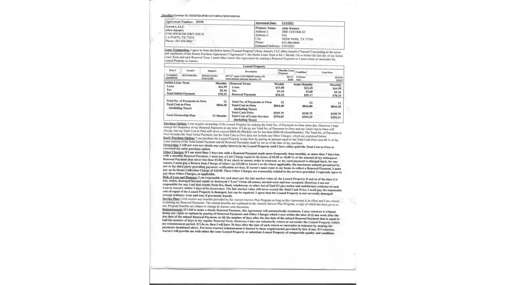 I was charged double almost two years ago for a HP 14" laptop, I will have it paid for July 2022 after paying 24 payments at 70.35 cash total after all payments totals 1688.00. I really didn't pay any attention to the price at the time. I had no credit and was really needing a computer. I guess I can't remember what I thought about the price. Why I am now reporting a problem is a few weeks ago my daughter was needing a computer. I thought I will have this computer paid for in a few months and I can give her this one and I will buy me another new one. I called the manager of the store in Laporte Tx and asked him about another HP laptop he had one but it was a 15". So I asked him how much he told me it would be 12 payments at 70.35 and cash price would be 844.00 when I was done paying all payments. I told him okay and they delivered the computer. It was a HP 15" Laptop. After the computer was delivered for some reason I got to looking at the contract. I thought why is this one cheaper and it is a bigger laptop. I compared contracts and seen I was paying double for the 14" HP so I called the store mgr and asked him why was this computer less than the one two years ago. He told me he was not involved with the sale and I must of agreed on that price. I could not understand his explanation. Why would I want to pay two years verses one year and cheaper. He could not tell me and so I just left it at that. The more I thought about it the more I got mad. I am 70 years old and on a fixed income and paying almost 2000 dollars for a plain HP laptop was ridiculous and I wanted an explanation and I still do. Also I found out on the internet that 2 years ago Progressive Leasing had a class action lawsuit against it and guess who owned Progressive Aaron's did. So maybe that is why I was charged such a high price. I also was charged for Microsoft 365 office of 170 dollars which I was not asked if I wanted it didn't even know I had it on my laptop. Also the security I was charged 42.00 . I also noticed that both contracts are not signed by the sales person they are typed in General manager or manager.